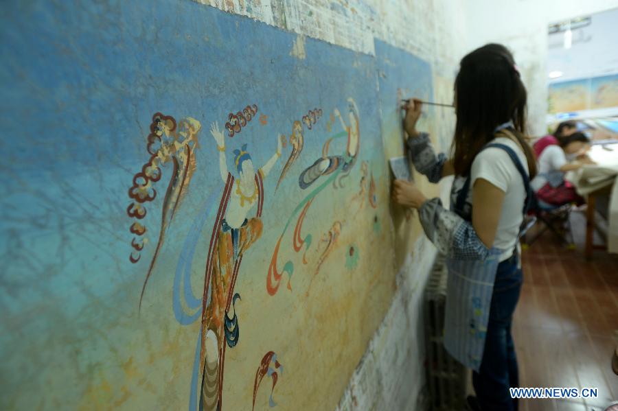 A painter draws a mural painting at a studio in Yuequan Town, Dunhuang City, northwest China's Gansu Province, June 27, 2014. Attracted by the art form of Mogaoku Grottos mural, more and more young artists gathered in Dunhuang to learn for mural creation and set up their studios. [Xinhua/Nie Jianjiang]