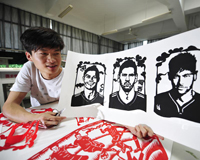Young craftsman scissors World Cup on paper Body paintings feature World Cup elements Chinese performance in Cambodia