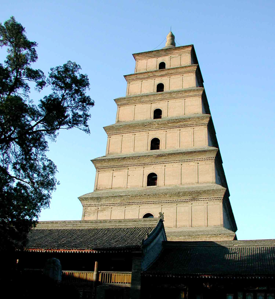 The Great Wild Goose Pagoda was established in the 3rd year (652) of the Yonghui reign of the Tang Dynasty (618-907), when Li Zhi, Emperor Gaozong, built it to settle the Sutra Classics brought back by Monk Xuan Zang from India. Formerly named the Pagoda of the Ci'en Temple, the pagoda received its present name based on a legend from the Great Tang Records of the Western Regions. The 64-meter-high pagoda has a square internal plane, and stairs with hand rails lead to the top. On the four sides of each floor, there are arched doors from which visitors can have a birds-eye view of the area. Preserved on the four stone doors in the base of the pagoda are exquisite engravings of the Tang. The forehead of the west stone gate is carved with architecture joss patterns and pictures with vigorous and smooth lines, which are significant materials of ancient Chinese architecture, painting and sculpture research. Two steles with the Preface to the Sacred Religion written by the famous Tang calligrapher Chu Suiliang are set into the walls on either side of the south door of the pagoda.