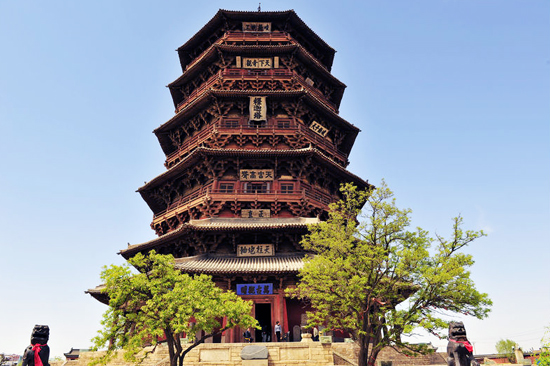 The Buddha Tower of Yingxian County, the oldest and tallest wooden Buddha Tower in China was built in 1056AD. The base of the pagoda has a radius of 30 meters and is 67.13 meters high. This octagonal five-storied pagoda has 54 dougong (a system of brackets inserted between the top of a column and a crossbeam) and typifies Buddha towers in Chinese architecture. After 900 years, it has withstood several earthquakes because the Buddha tower has a big body and the floors are largely separated from each other. Staircases inside the pagoda give people access to the top of the tower so they can enjoy the surroundings.