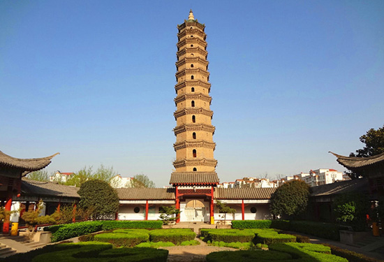 The Iron Pagoda of Youguo Temple of Kaifeng, Henan province, is a Buddhist pagoda built in 1049 AD during the Northern Song Dynasty of China. The pagoda is named not because it is made of iron, but because its color resembles that of iron. Thus, it has been named the Iron Tower since the Yuan Dynasty. This octagonal-base structure stands at 55.88 meters. The exterior features varieties of glazed brick and intricate and richly detailed carvings, including flying Apsaras and Chinese dragon.