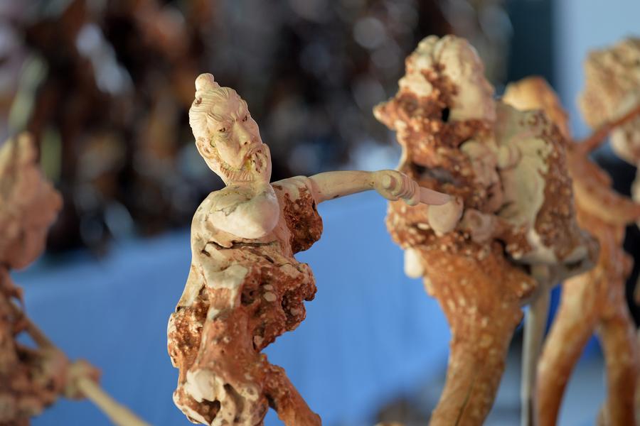 The root-carved figurines are modeled after the 108 characters from the Chinese classic novelThe Water Margin(Shuihuzhuan) and are on display at Wang Zhimin's workshop in Chaoyang, Liaoning province, July 8, 2014. [Photo/Xinhua]