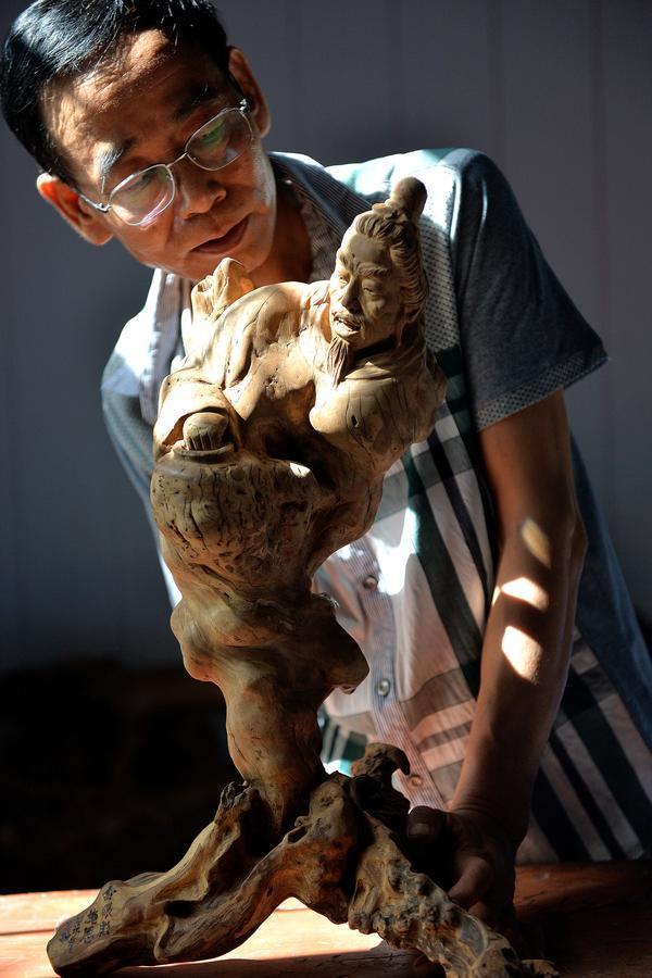 Wang Zhimin gazes at one of his root-carved figurines modeled after just one of the 108 characters from the Chinese classic novelThe Water Margin(Shuihuzhuan) at his workshop in Chaoyang, Liaoning province, July 8, 2014. [Photo/Xinhua]