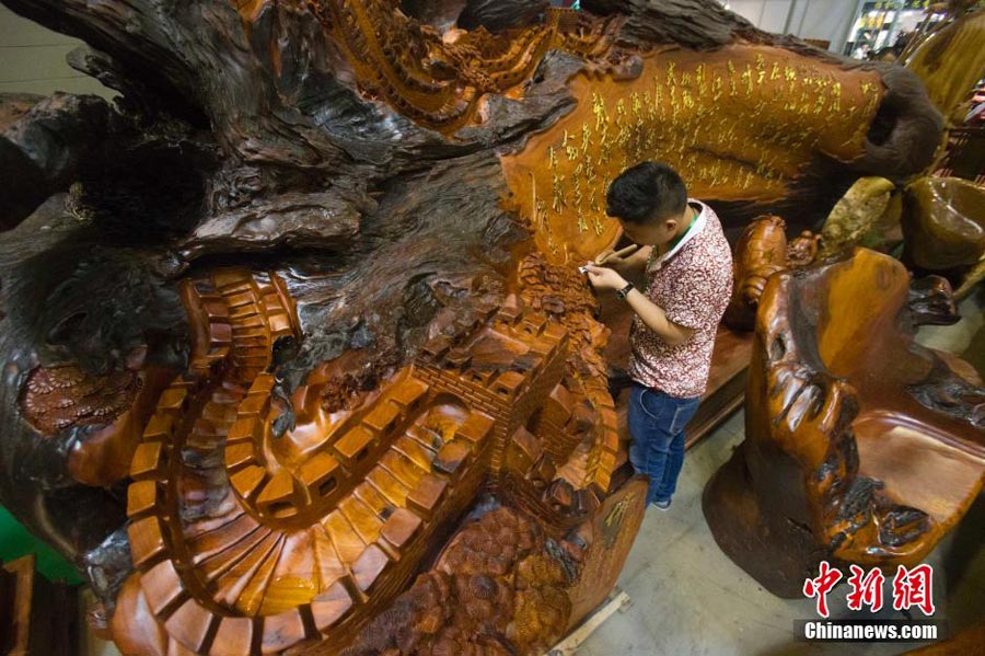 A giant root carving with Chairman Mao Zedong's poem, the Great Wall, pine and cypress trees is for sale at the price of 12 million yuan ($1.93 million). It took 10 craftsmen a year to finish the 6 meters long, 2.5 meters tall and 1.5 meters wide work. [Photo/Chinanews.com]