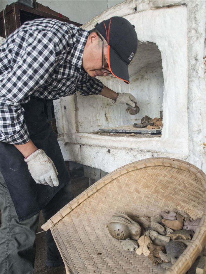 The process of calcination during the making ofnijiaojiaoat Zhou's studio, in Zhenjiang, Jiangsu province, July 15, 2014. [Photo by Feng Jiangjiang/Asianewsphoto]