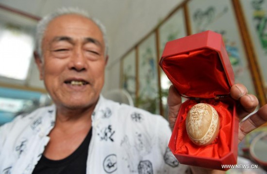 Huang Zhankui, a farmer from Yangjiatun village in Tangshan city, shows his first egg carving handicraft, portrait of contemporary Chinese artist Qi Baishi, in Tangshan, north China's Hebei Province, July 17, 2014. Huang, 70 years old, has been studying egg-carving for 10 years in his leisure time.(Xinhua/Li Junyi)
