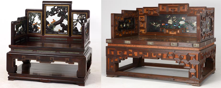 L: Red sandalwood throne chair with lacquered seat and design of pine, bamboo and plum blossom. R: Jade-and-bamboo embedded throne, made of pterocarpus indicus. Collections from The Palace Museum [Photo provided to chinadaily.com.cn]