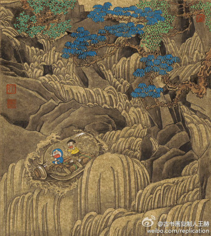 Wang He, a young painter at the Palace Museum who is proficient at copying ancient calligraphy and paintings, created a series of paintings, letting Doraemon and Nobita, main characters of the famous Japanese cartoon Doraemon, traveling through time to ancient Chinese paintings. The hilarious has gone viral online, reminding numbers of Doraemon fans of their childhood. (Photo source: Sina Weibo)