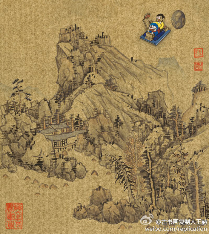 Wang He, a young painter at the Palace Museum who is proficient at copying ancient calligraphy and paintings, created a series of paintings, letting Doraemon and Nobita, main characters of the famous Japanese cartoon Doraemon, traveling through time to ancient Chinese paintings. The hilarious has gone viral online, reminding numbers of Doraemon fans of their childhood. (Photo source: Sina Weibo)