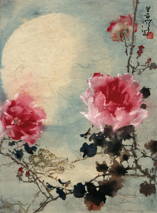 A painting of roses under the moonlight.