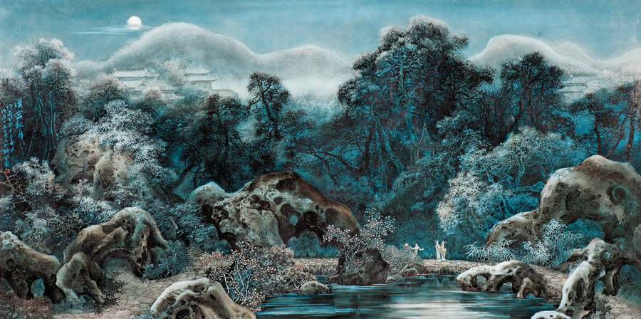 An overglazed decorated plaque depicting a palace of the Han Dynasty under the autumn moon.