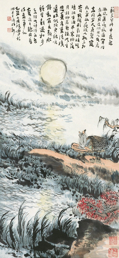 A painting depicting a scene of a boat floating in the lake by moonlight.