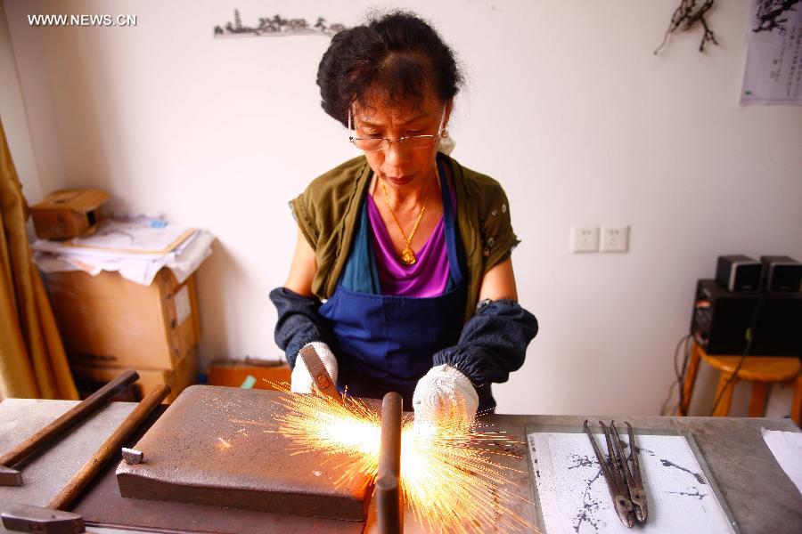 Chu Jinxia works in a studio in Chu Iron Picture factory in Wuhu, East China's Anhui province, Sept. 18, 2014. Chu Jinxia, an inheritor of iron picture craftwork, learned the art from her father Chu Yanqing, a great master of iron picture. Having a history of about 350 years, the iron picture was listed as the first batch of national intangible cultural heritages in 2006. The iron picture craftwork, which uses iron as material to make pictures, has been transfered from generation to generation in Wuhu, East China's Anhui province and now has been introduced to college students and professors, which leads a new road for the craftwork to develop itself. [Photo/Xinhua]