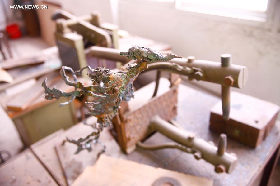 Photo taken on Sept. 18, 2014 shows an abstract work in a studio in Chu Iron Picture factory in Wuhu, East China's Anhui province. Chu Jinxia, an inheritor of iron picture craftwork, learned the art from her father Chu Yanqing, a great master of iron picture. Having a history of about 350 years, the iron picture was listed as the first batch of national intangible cultural heritages in 2006. The iron picture craftwork, which uses iron as material to make pictures, has been transfered from generation to generation in Wuhu, East China's Anhui province and now has been introduced to college students and professors, which leads a new road for the craftwork to develop itself.[Photo/Xinhua]