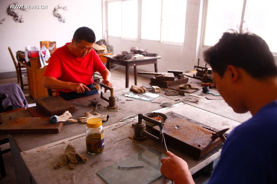 Workers work in a studio in Chu Iron Picture factory in Wuhu, East China's Anhui province, Sept. 18, 2014. Chu Jinxia, an inheritor of iron picture craftwork, learned the art from her father Chu Yanqing, a great master of iron picture. Having a history of about 350 years, the iron picture was listed as the first batch of national intangible cultural heritages in 2006. The iron picture craftwork, which uses iron as material to make pictures, has been transfered from generation to generation in Wuhu, East China's Anhui province and now has been introduced to college students and professors, which leads a new road for the craftwork to develop itself.[Photo/Xinhua]