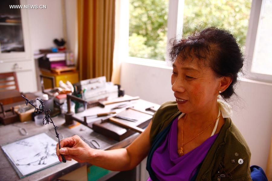 Chu Jinxia works in a studio in Chu Iron Picture factory in Wuhu, East China's Anhui province, Sept. 18, 2014. Chu Jinxia, an inheritor of iron picture craftwork, learned the art from her father Chu Yanqing, a great master of iron picture. Having a history of about 350 years, the iron picture was listed as the first batch of national intangible cultural heritages in 2006. The iron picture craftwork, which uses iron as material to make pictures, has been transfered from generation to generation in Wuhu, East China's Anhui province and now has been introduced to college students and professors, which leads a new road for the craftwork to develop itself.[Photo/Xinhua]