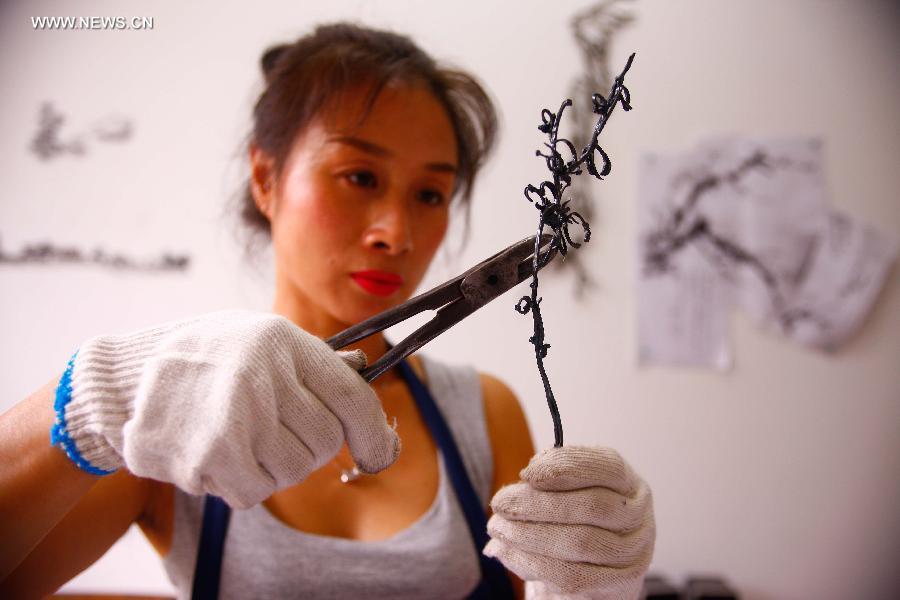 Chu Liwen, daughter of Chu Jinxia, works in a studio in Chu Iron Picture factory in Wuhu, East China's Anhui province, Sept. 18, 2014. Chu Jinxia, an inheritor of iron picture craftwork, learned the art from her father Chu Yanqing, a great master of iron picture. Having a history of about 350 years, the iron picture was listed as the first batch of national intangible cultural heritages in 2006. The iron picture craftwork, which uses iron as material to make pictures, has been transfered from generation to generation in Wuhu, East China's Anhui province and now has been introduced to college students and professors, which leads a new road for the craftwork to develop itself.[Photo/Xinhua]