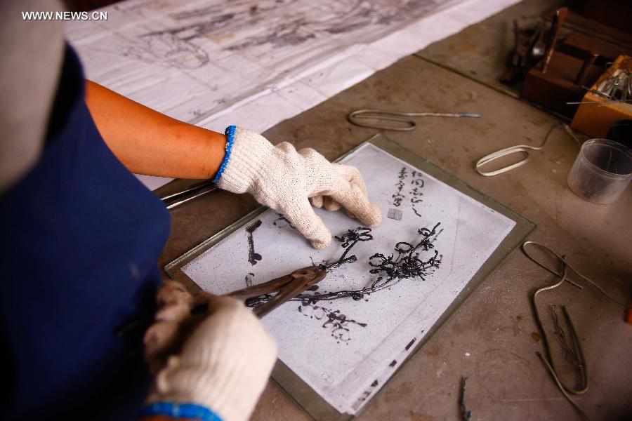 Chu Liwen, daughter of Chu Jinxia, works in a studio in Chu Iron Picture factory in Wuhu, East China's Anhui province, Sept. 18, 2014. Chu Jinxia, an inheritor of iron picture craftwork, learned the art from her father Chu Yanqing, a great master of iron picture. Having a history of about 350 years, the iron picture was listed as the first batch of national intangible cultural heritages in 2006. The iron picture craftwork, which uses iron as material to make pictures, has been transfered from generation to generation in Wuhu, East China's Anhui province and now has been introduced to college students and professors, which leads a new road for the craftwork to develop itself.[Photo/Xinhua]