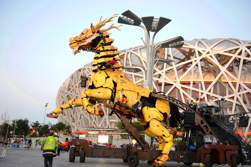 A mechanical horse-dragon made of wood and steel is seen in rehearsal, on Oct 15, 2014.[Photo by Hu Qingming/asianewsphoto.com]