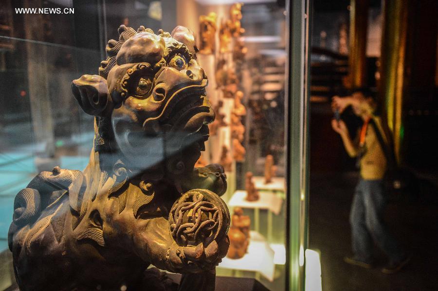 A visitor takes photos at the China Woodcarving Museum in Dongyang, East China's Zhejiang province, Oct. 16, 2014. The museum will officially open to the public on Oct. 18. [Photo/Xinhua]