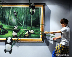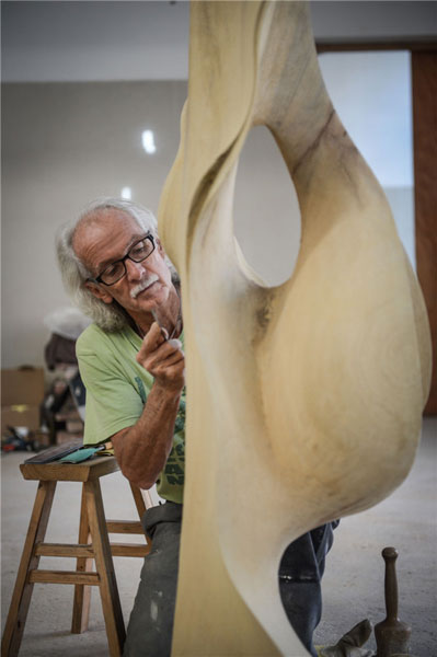 A sculptor from Switzerland works on a sculpture at the international wood carving contest in Dongyang city, Zhejiang province, Oct 16, 2014. [Photo/Xinhua]