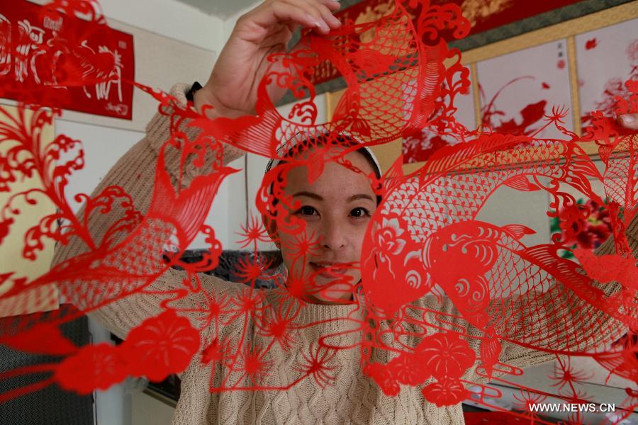 A handicraftsman shows a paper cutting artwork in a studio in Jianping County, northeast China's Liaoning Province, Oct. 22, 2014. Paper cutting, the traditional Chinese folk art which uses red paper as material to make pictures by scissors, has been transfered from generation to generation in Jianping County and now has developed into a cultural industry. [Photo/Xinhua]
