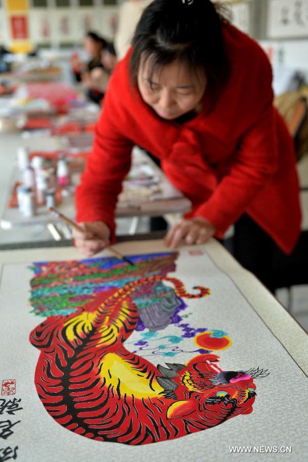 A handicraftsman colours a paper cutting in a studio in the Hongshan Subdistrict of Jianping County, northeast China's Liaoning Province, Oct. 22, 2014. Paper cutting, the traditional Chinese folk art which uses red paper as material to make pictures by scissors, has been transfered from generation to generation in Jianping County and now has developed into a cultural industry.[Photo/Xinhua]