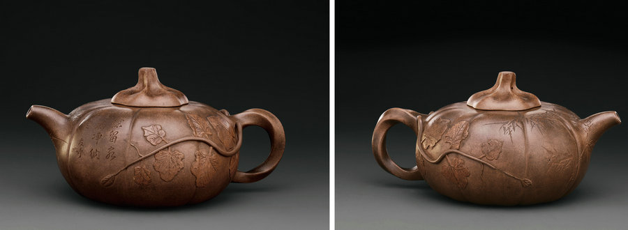 A pumpkin-shaped teapot with inscriptions and the hallmark of You Zhu. [Photo/ english.cguardian.com]