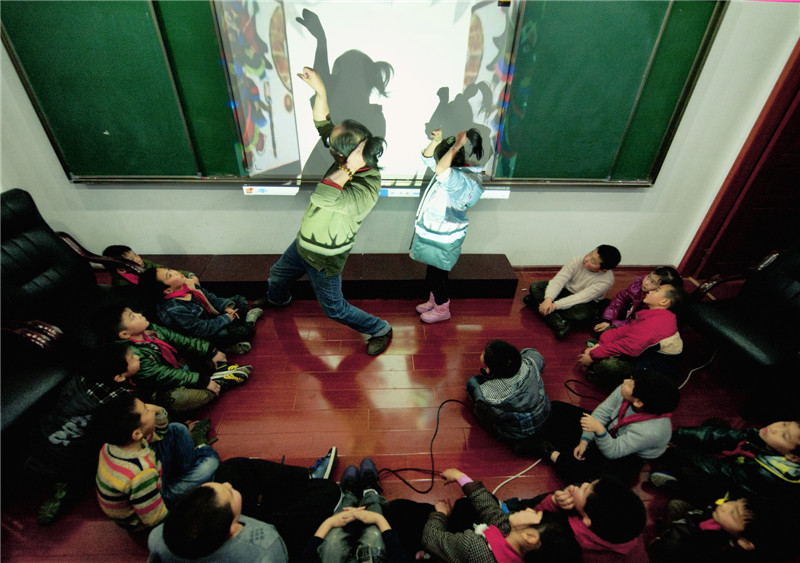 Shen Xiao helps children during a hand shadow show at a primary school in Mianzhu city, Sichuan province, Dec 14, 2012. [Photo/Xinhua]