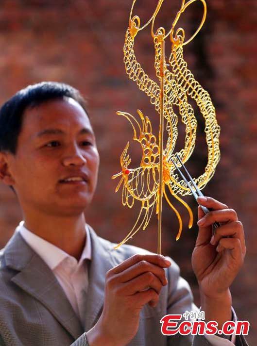 Liu Shengli shows the detail on some of his sugar art creations in Zhengzhou, Henan province, Nov 13, 2014. [Photo/Chinanews.com]