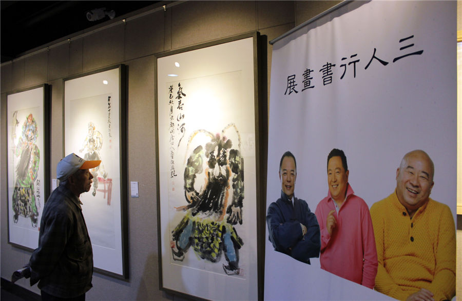The famous Chinese painter Fan Yang, TV host Dong Hao and actor Zhang Tielin are exhibiting their paintings and calligraphy at the Handejingshe art gallery in Suzhou. More than 100 pieces of art are on display and the exhibition will run through Dec 10. They are all art lovers since childhood and have never ceased pursuing their art dreams.