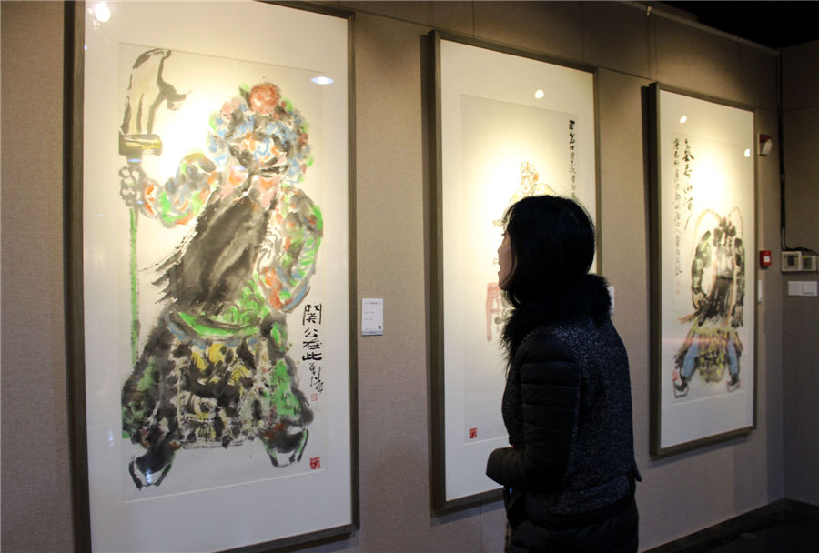 A visitor looks at paintings by Chinese TV host Dong Hao in Suzhou, Jiangsu province, Nov 27, 2014. [Photo by Wang Jiankang/Asianewsphoto]