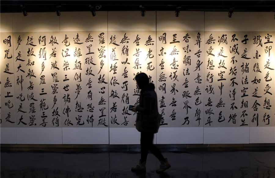 A visitor walks past a calligraphy work by artist Fan Yang in Suzhou, Jiangsu province, Nov 27, 2014. [Photo by Wang Jiankang/Asianewsphoto]