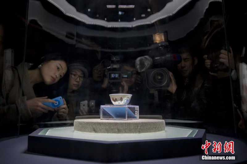 A Ming Chenghua bucket color chicken cup is displayed in Shanghai on Dec. 18, 2014. The cup was sold for $ 36 million, which has broken the auction record of Chinese porcelain. There are only 15 similar cups in the world, and majority of them have been kept in museums. [Photo/CNS]