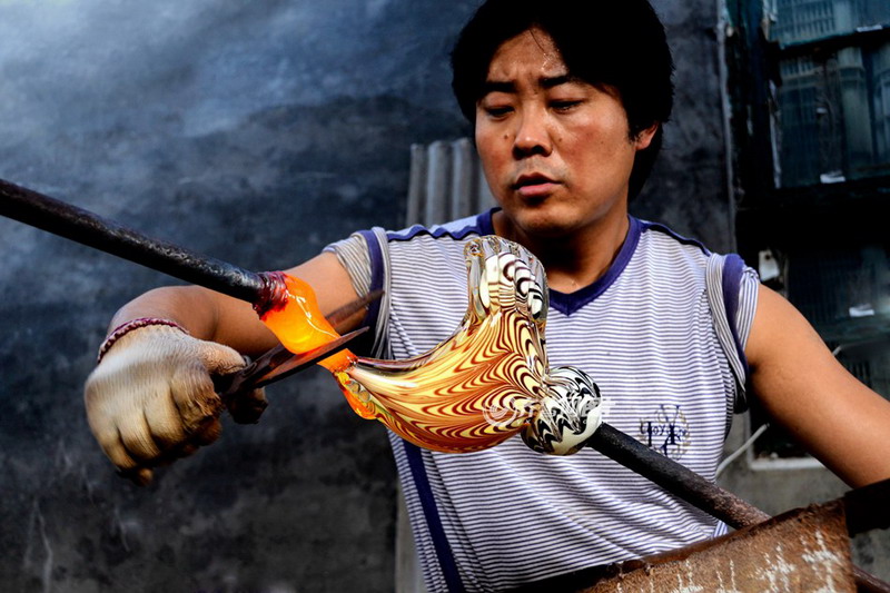 Braving temperature as high as 1,000 degrees Celsius, workers meticulously work on the colored glaze to design the most beautiful art ware.[Photo/Iqilu.com]