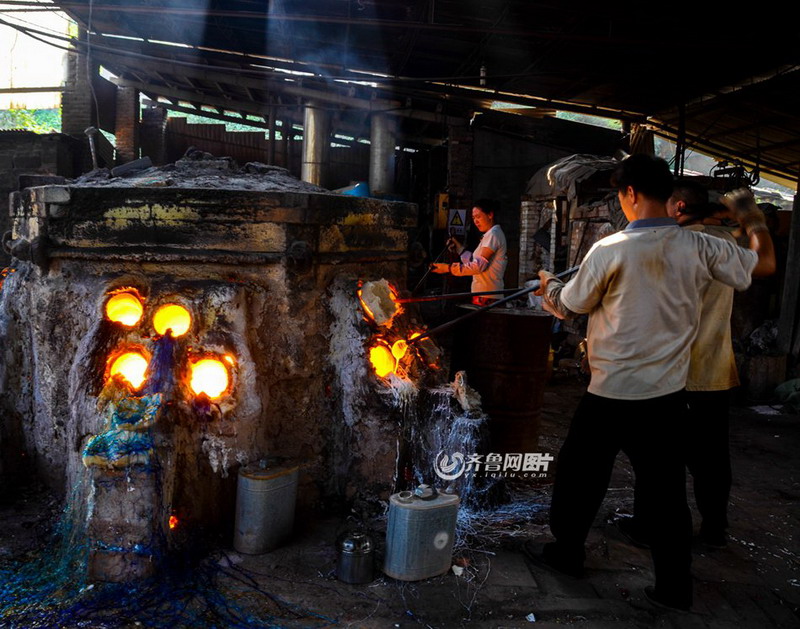 Braving temperature as high as 1,000 degrees Celsius, workers meticulously work on the colored glaze to design the most beautiful art ware.[Photo/Iqilu.com]