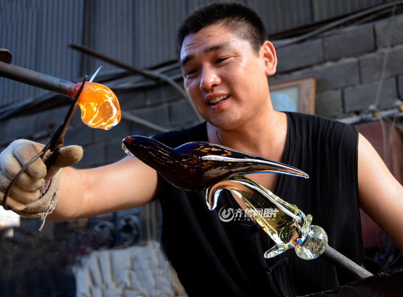 Braving temperature as high as 1,000 degrees Celsius, workers meticulously work on the colored glaze to design the most beautiful art ware.[Photo/Iqilu.com]