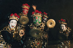 Alongside the dominant dialogues there are also numerous old folkloric themes that were typically heard in the past at rural festivals, weddings, and funeral processions. The accompanying instruments are primarily small drums and gongs.