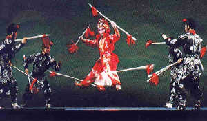 Flags are also frequently used on the stage. A square flag with the Chinese character for "marshal" on it, a rectangular flag with the Chinese character for "commander" on it, and a flag with the name of a certain army on it represent the location of army camps and commanders-in-chief. In addition, there are water, fire, wind, and vehicle flags. Actors shake these flags to represent waves, fire, wind, or moving vehicles.