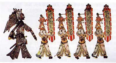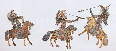 Shadow plays inGansu Provincehave produced long lists of plays. The picture above depicts a story in the Sui and Tang dynasties. The figures and stage props are so carefully carved that one can't help but to find the play interesting. Bright colors are used for decoration and different parts of the body are properly manipulated for skillful performance.