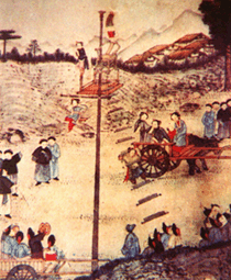 Part four focuses on circus performances and stunts performed on drum carts. Great skill and daring is quite obviously required to perform handstands and spinning meteor-like bulbs on the backs of galloping horses or on moving drum carts. Numerous ancient items, including hand tricks, handstands, tightrope walking, horsemanship, and pole climbing on moving carts, are still performed in modern China.