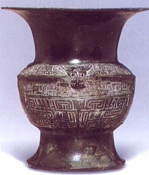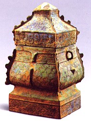 Dings were used in Chinese Primitive Society as cooking utensils. At first they were made of pottery clay. Then, as metallurgy emerged and developed, the material was changed to bronze at the end of the Shang Dynasty about 3000 years ago. By that time, dings had changed function to become sacrificial vessels and the symbol of their owners' power and wealth. Bronzeware of the Shang Dynasty includes vessels Such as the ding the li which is an ancient cooking tripod with hollow legs, the zun, a wine vessel used in ancient times, and the hu, a type of pot. There are also weapons andmusical instrumentssuch as the nao or big cymbal, the ling or bell, the drum and chimes. Of all the bronzeware, it is the vessels that display the greatest variety.