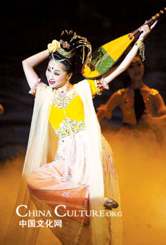 The choreography of The Rain of Flowers along the Silk Road was inspired from Dunhuang murals, a famous Buddhist cultural site in western China’s Gansu province. Buddhist monks would paint beautiful pictures on the walls of caves in Dunhuang, which was a major Silk Road crossroads between China and Central Asia. The paintings reflected the wide experiences of the monks, who were usually travelers along the Silk Road.