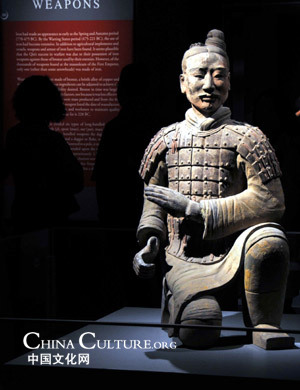 A terra cotta warrior is on display at the Houston Museum of Natural Science in Houston, the United States, on Oct. 18, 2009. The exhibition "Terra Cotta Warriors: Guardians of China's First Emperor" is concluded at the museum on Sunday, receiving over 200,000 visitors during its 5-month-long exhibition period. (Xinhua/Chen Ruwei)