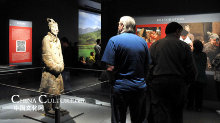 Visitors admire the displayed terra cotta warrior at the Houston Museum of Natural Science in Houston, the United States, on Oct. 18, 2009. (Xinhua/Chen Ruwei)
