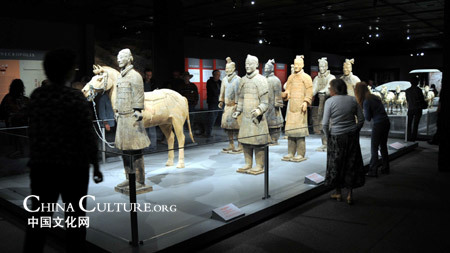Visitors admire the displayed terra cotta warriors at the Houston Museum of Natural Science in Houston, the United States, on Oct. 18, 2009. (Xinhua/Chen Ruwei)