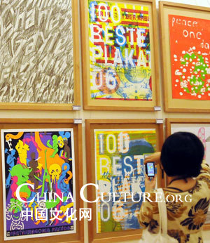A visitor takes pictures of the exhibited posters during the 4th China International Poster Biennial Exhibition held in Hangzhou, capital of east China's Zhejiang Province, Oct. 26, 2009. A total of 178 poster works were shown in the exhibition, which kicked off at the gallery of China Academy of Art in Hangzhou on Monday.