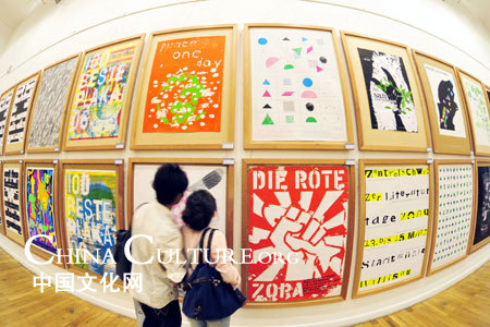 Visitors look at exhibited posters during the 4th China International Poster Biennial Exhibition held in Hangzhou, capital of east China's Zhejiang Province, Oct. 26, 2009. A total of 178 poster works were shown in the exhibition, which kicked off at the gallery of China Academy of Art in Hangzhou on Monday.