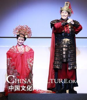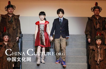 A Chinese girl is led by a Japanese boy during an introduction of Mulan's story in the centennial hall of Gakushuin University in Tokyo, capital of Japan, on Nov. 11, 2009. The Chinese opera "Mulan Psalm", putting together various forms of performance such as symphony, musical, theater and dance, and blending into the elements of Chinese folk music, singing techniques, national costumes and martial art, got a premiere in Tokyo on Wednesday.