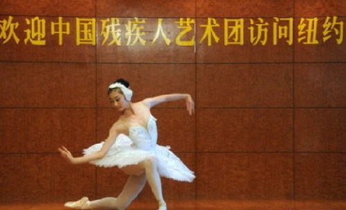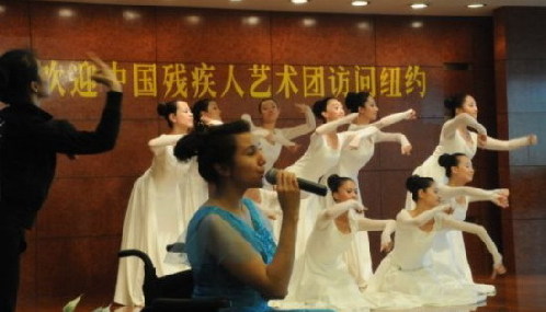 An artist of the China Disabled People's Performing Art Troupe (CDPPA) performs during a reception for the troupe held by the Chinese consulate-general in New York, the United States, on June 11, 2010. The China Disabled People's Performing Art Troupe will perform its musical "My Dream" in a few U.S. cities. (Xinhua/Wang Jiangang)